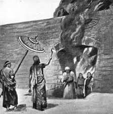 | Und an anderer Stelle (Biblische Heiligung, White, Ellen G.): Aus den Schätzen, die er als Kriegsbeute heimgebracht hatte, ließ er ein goldenes Bild machen, jenem ähnlich, das er im Traum gesehen hatte. Das ließ er in der Ebene von Dura aufstellen und befahl dann unter Androhung der Todesstrafe allen Würdenträgern und allen Bewohnern, es anzubeten. Dieses Standbild, über dreißig Meter hoch und etwa drei Meter breit, war für das abgöttische Volk ein höchst eindrucksvoller und majestätischer Anblick. Ein Erlaß forderte alle Beamten des Reiches auf, sich zur Einweihung des Standbildes einzufinden und beim ersten Ton der Musikinstrumente niederzufallen und es anzubeten. Wer diese Anbetung verweigerte, sollte ohne Verzug in einen glühenden Feuerofen geworfen werden. {BH 22.5} |