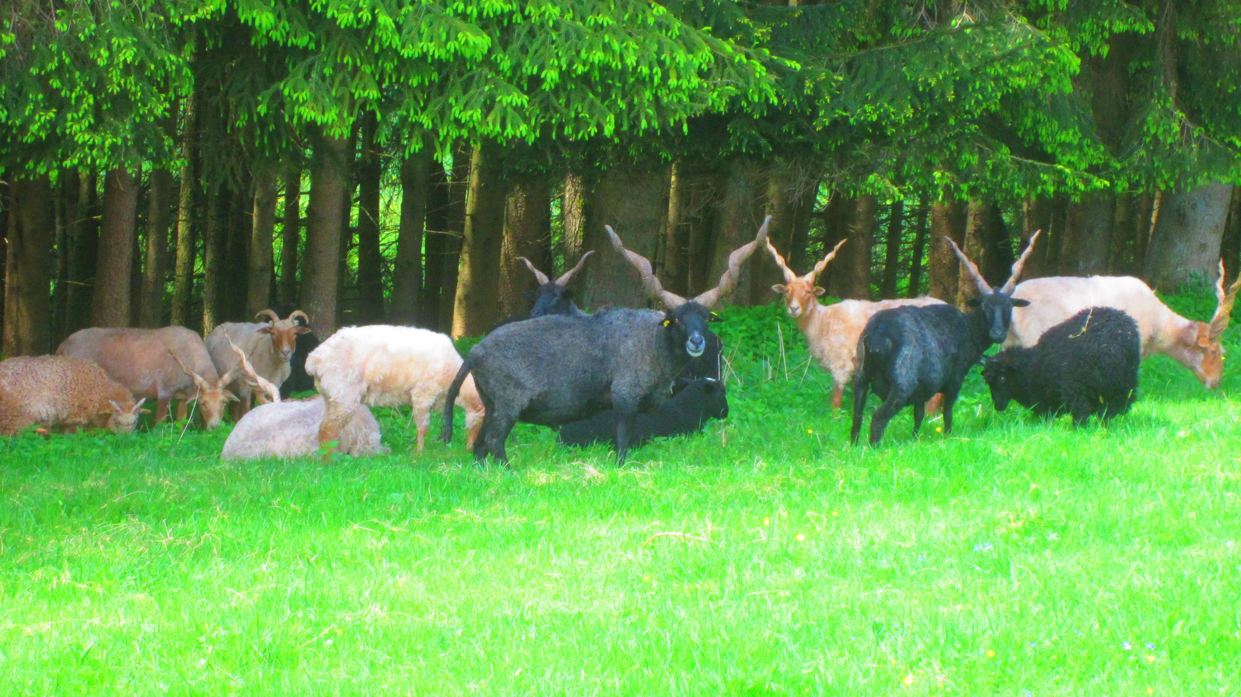 Ingolf biegt nach links weg. Ich meine aber, die Schafe sind auf dieser Seite des Bachs. Ich gehe noch ein Stück mit - dann laufe ich aber quer durch die Wiese Richtung Waldrand. Da hatte ich die Schafe von ganz weit hinten gesehen. Und ich habe Glück. Sie sind zwar ein bichen schüchtern und laufen erstmal weg - aber dann bleiben sie doch stehen. Zwischen ihnen und mir ist noch der Elektrozaun... und sie kommen nicht näher ran... aber geht auch so :-)