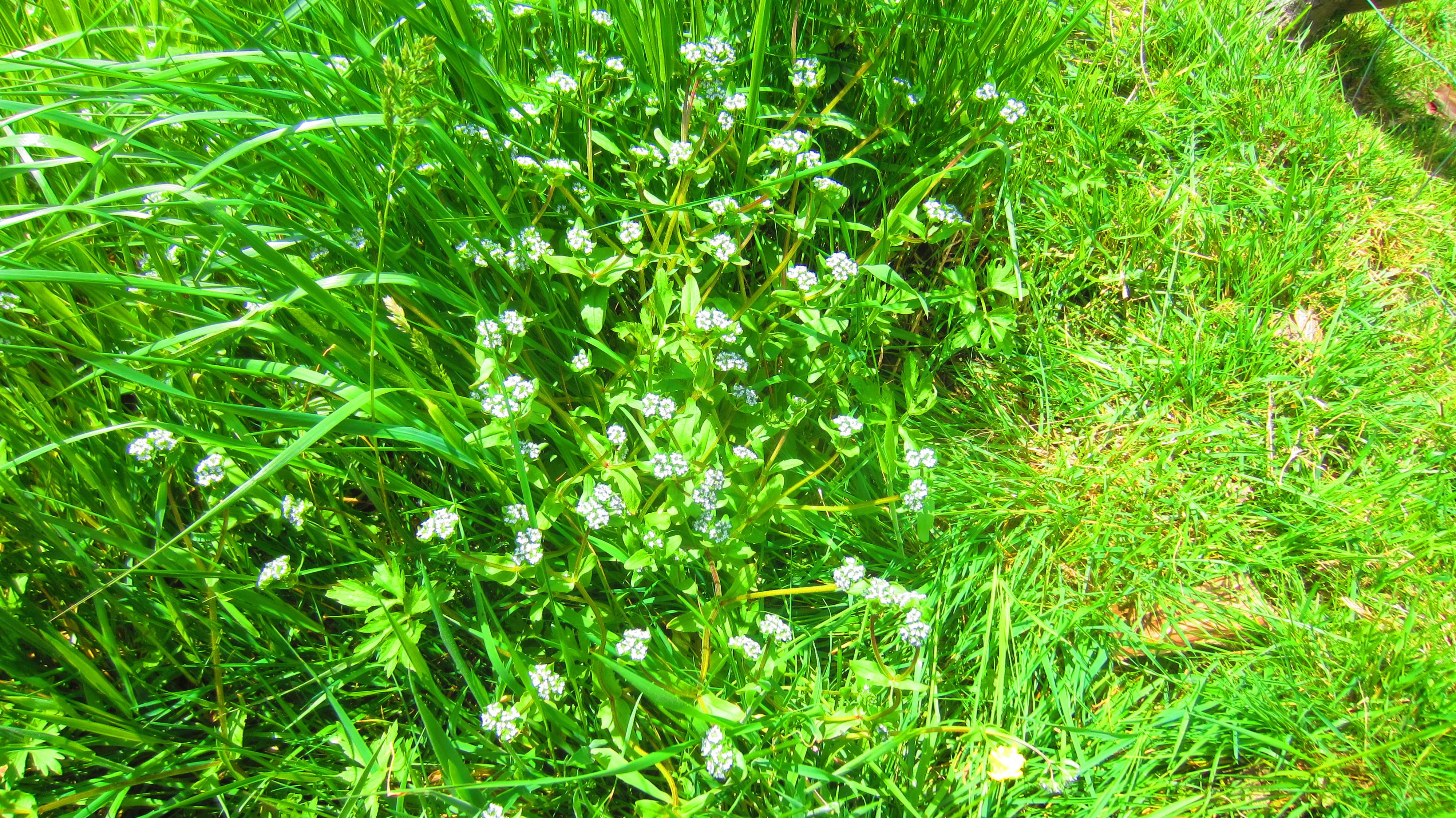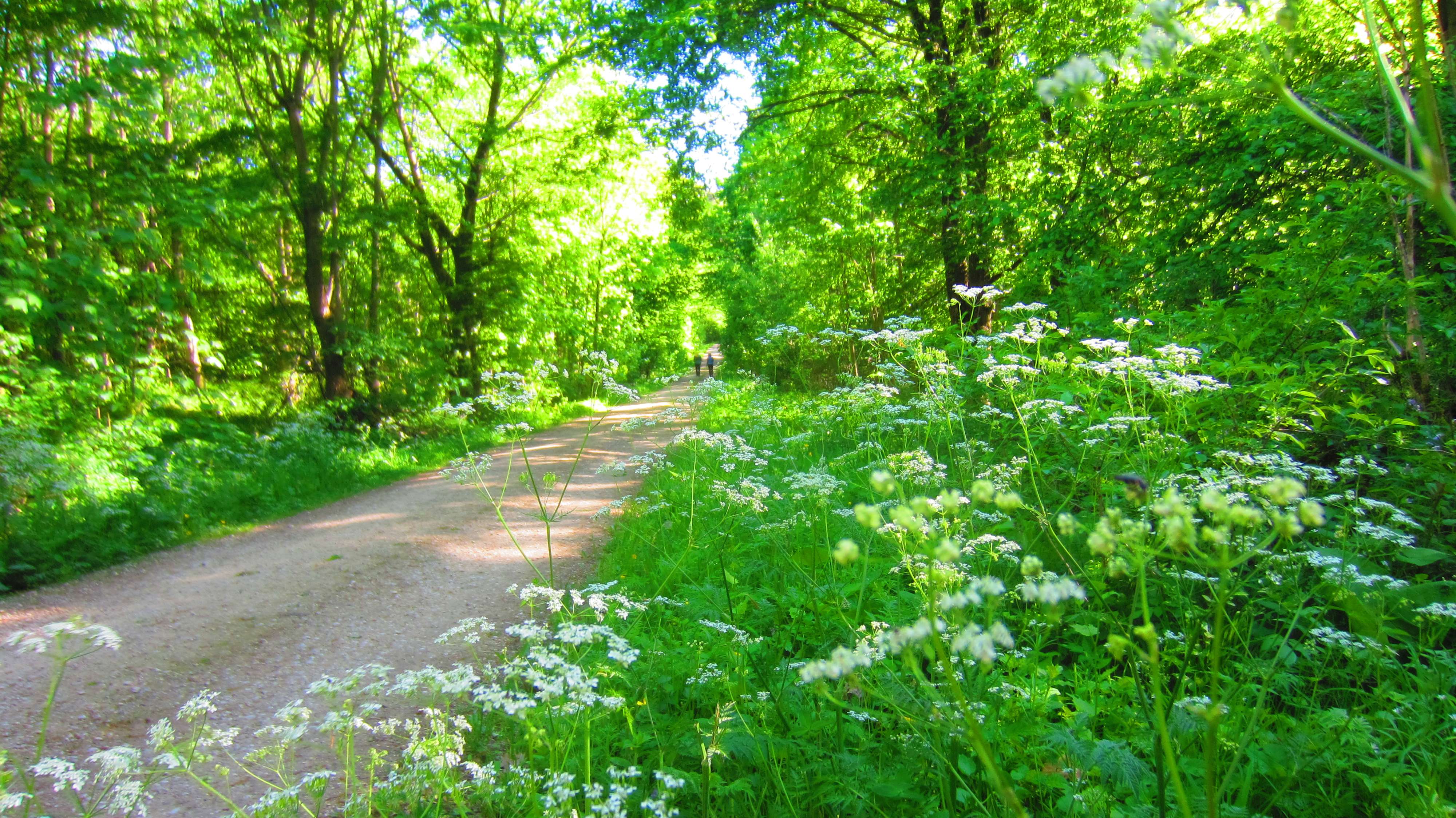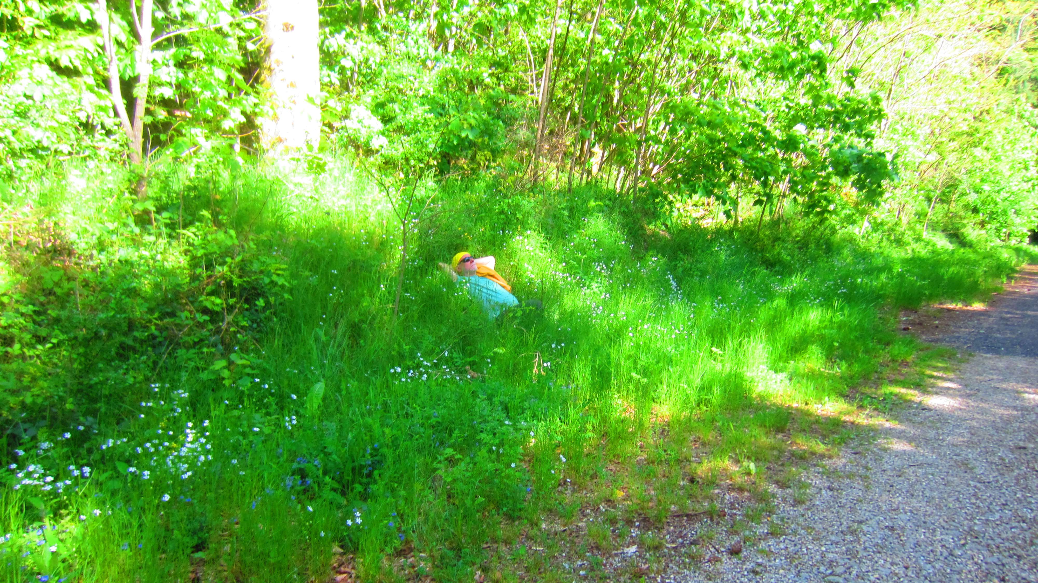 Ich trotte durchs hohe Gras wieder zum Weg zurück. Vorbei an blauen Blütenteppichen mit Männertreu/Ehrenpreis.