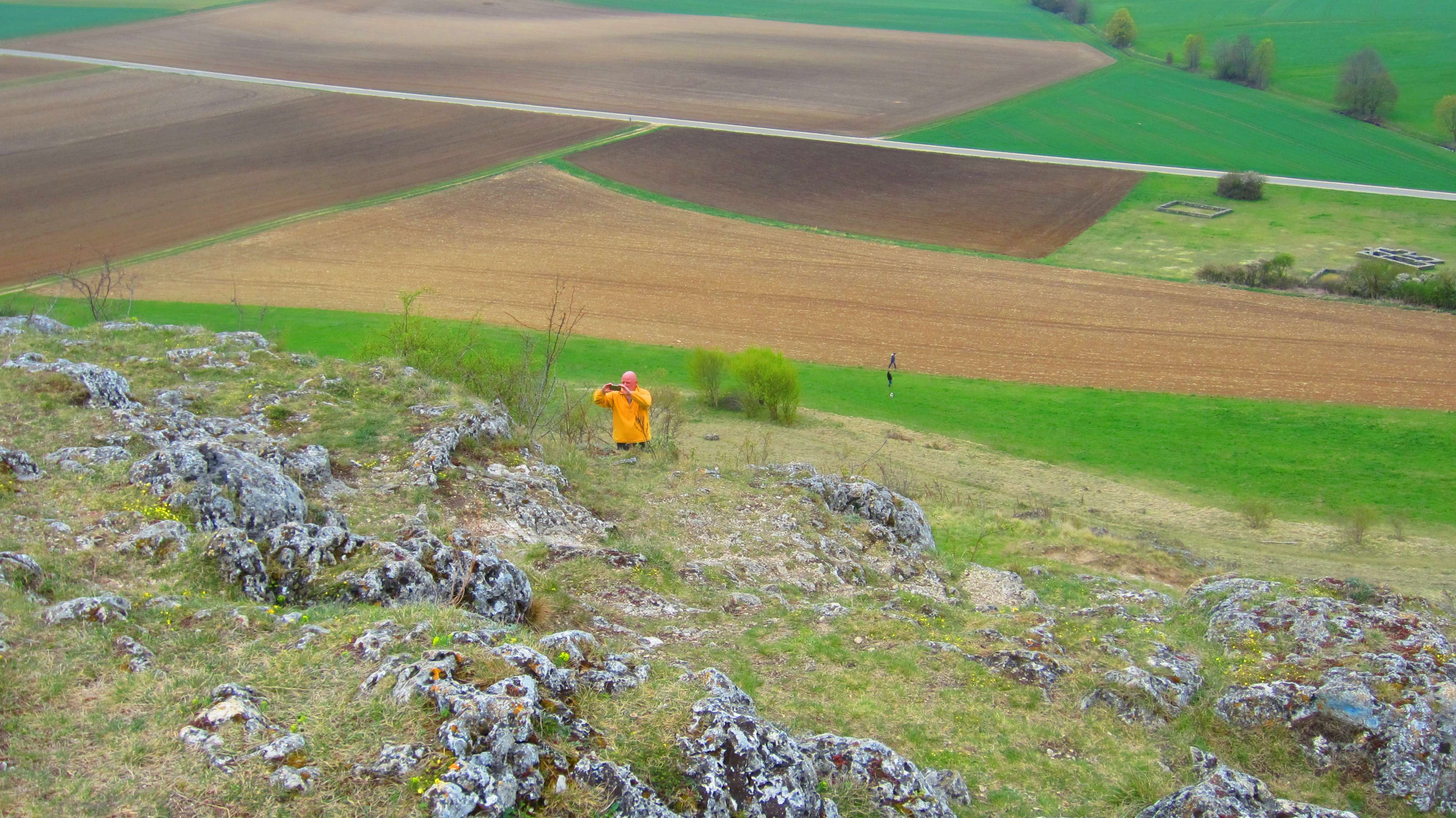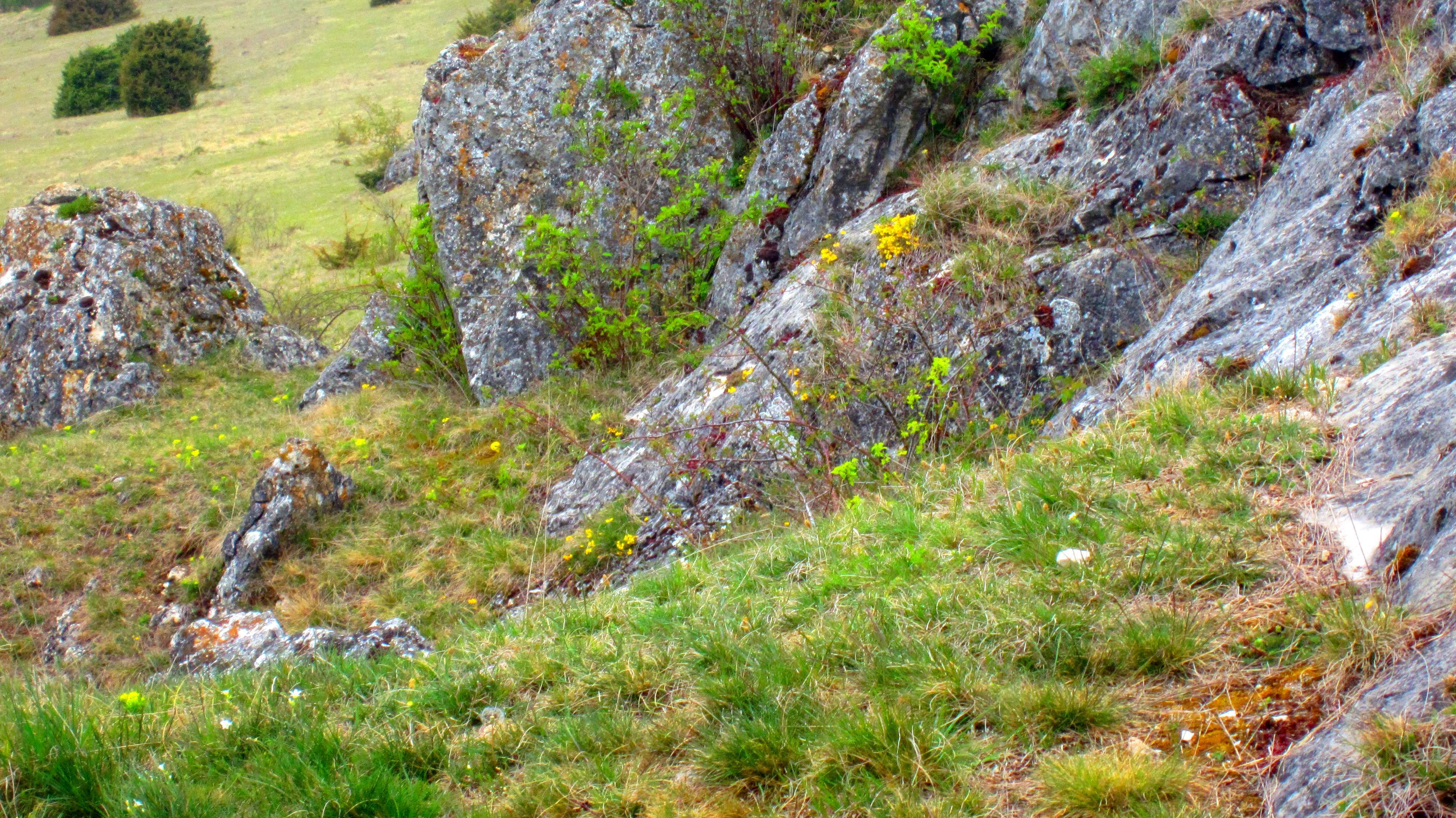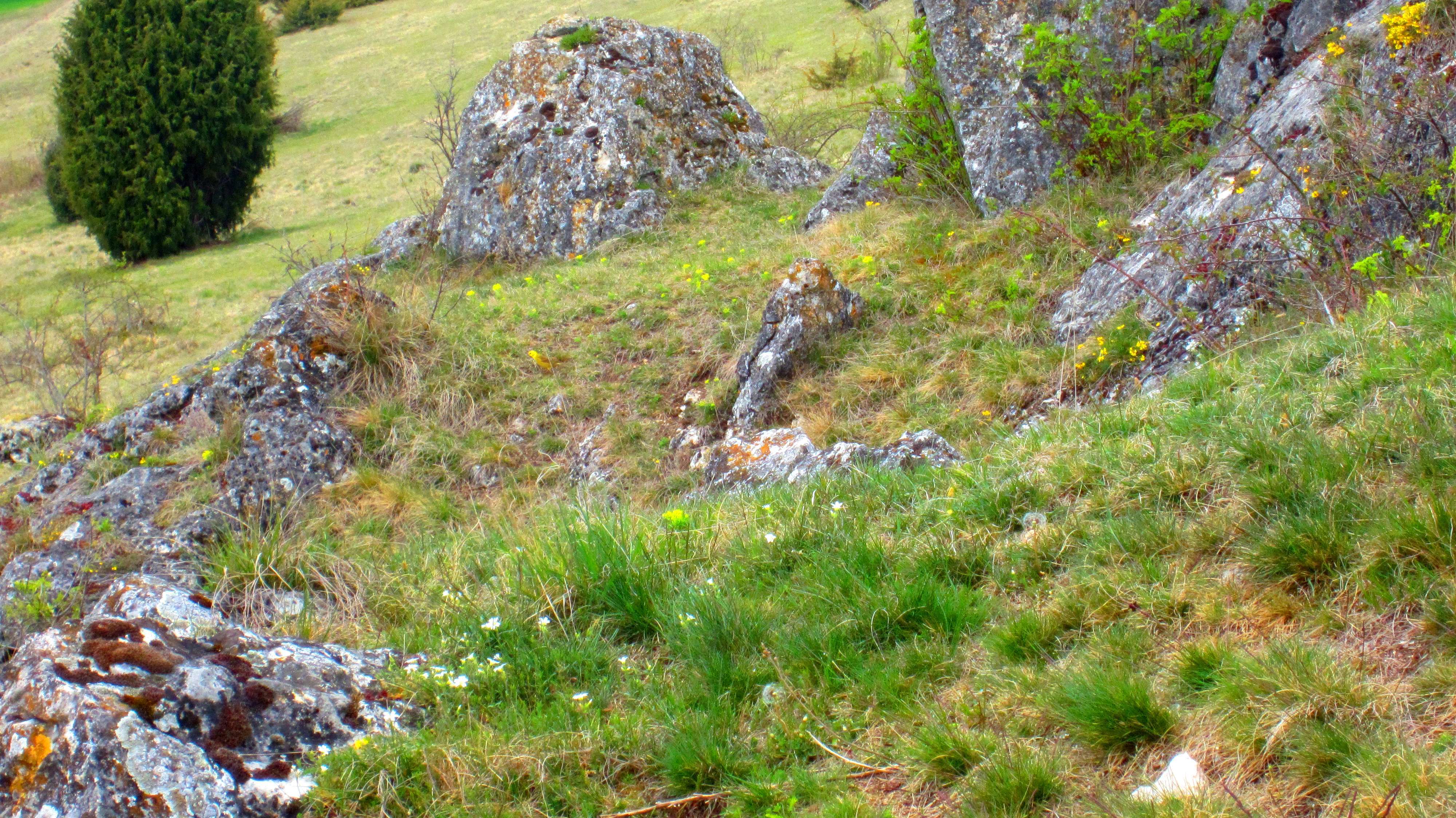 Goldammer (Mitte-links unter dem oberen Felsen, im Gras) ...