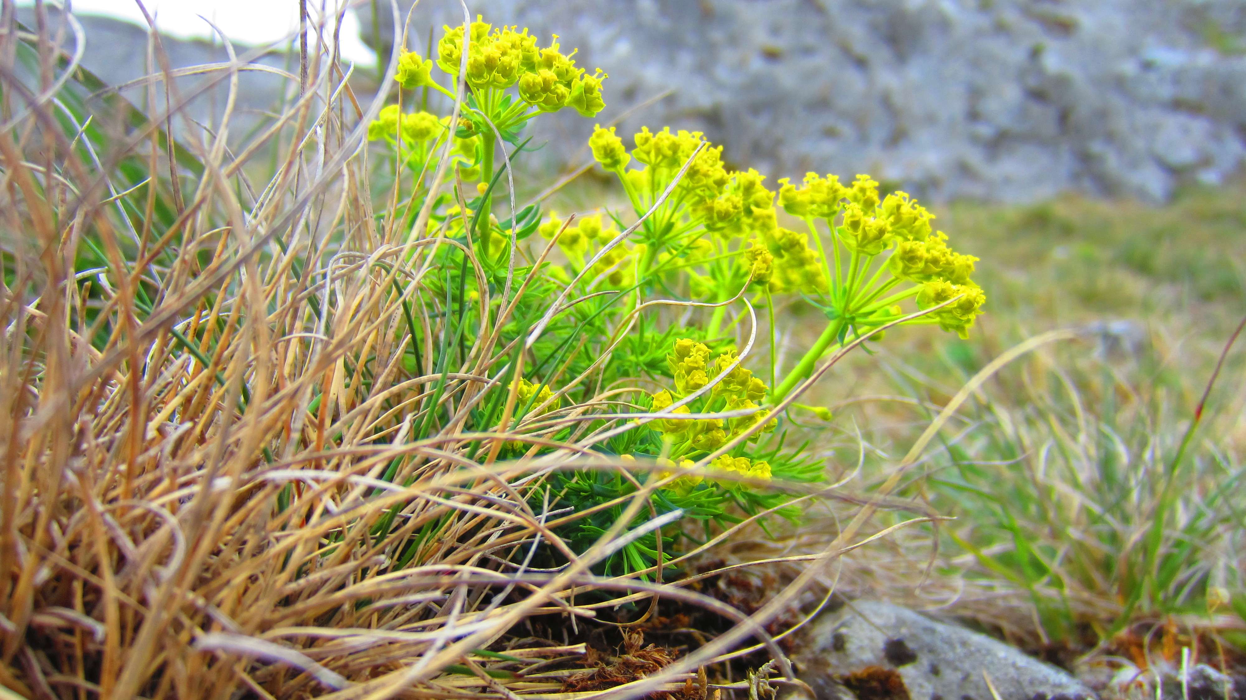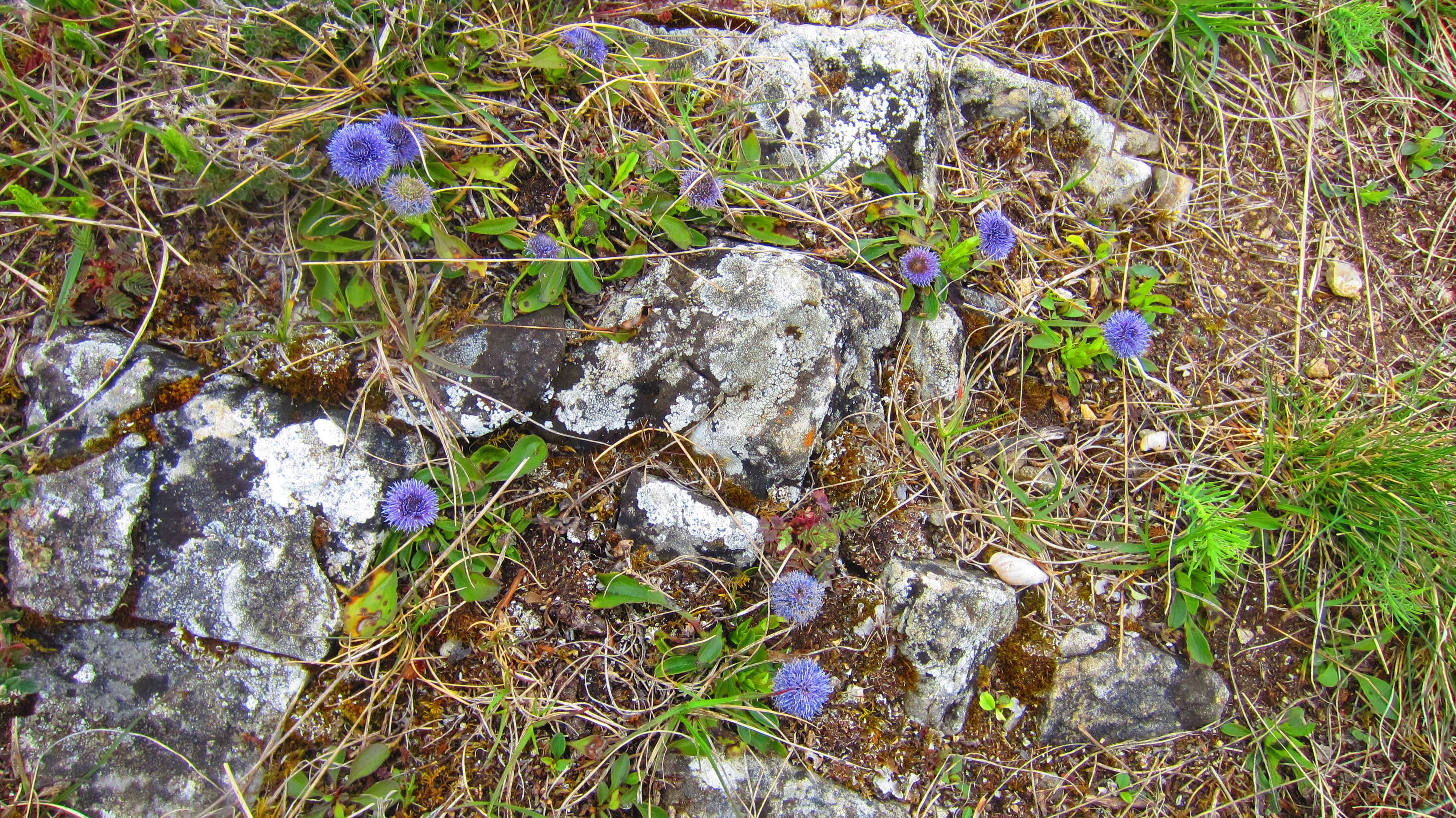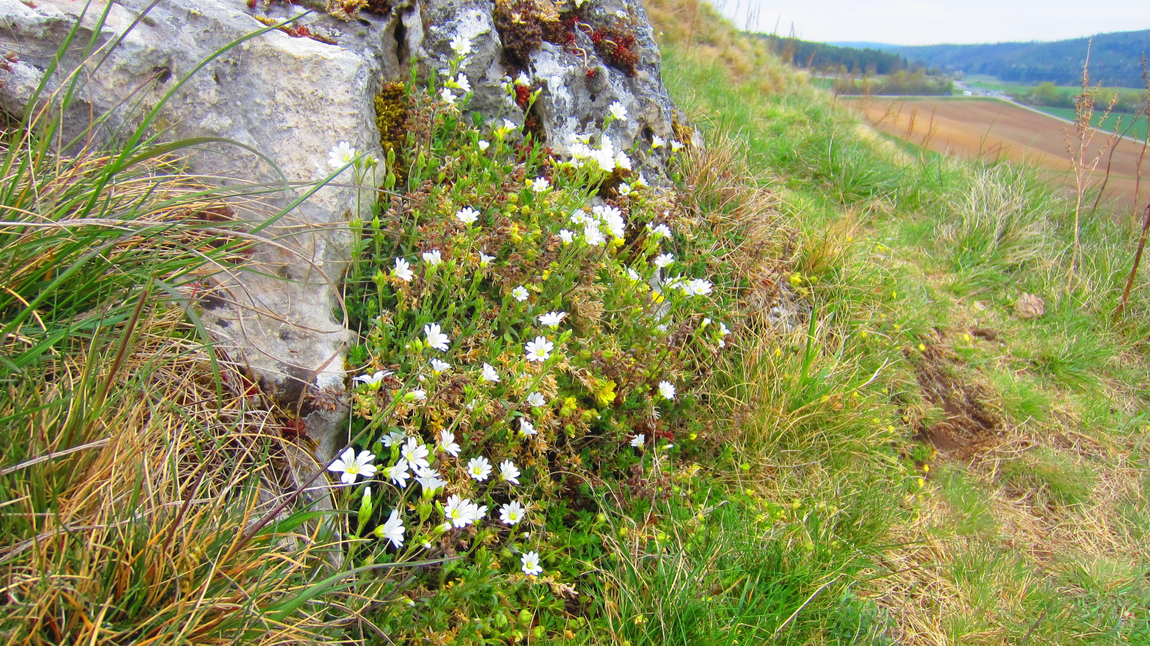 Goldammer (Mitte-links unter dem oberen Felsen, im Gras) ...