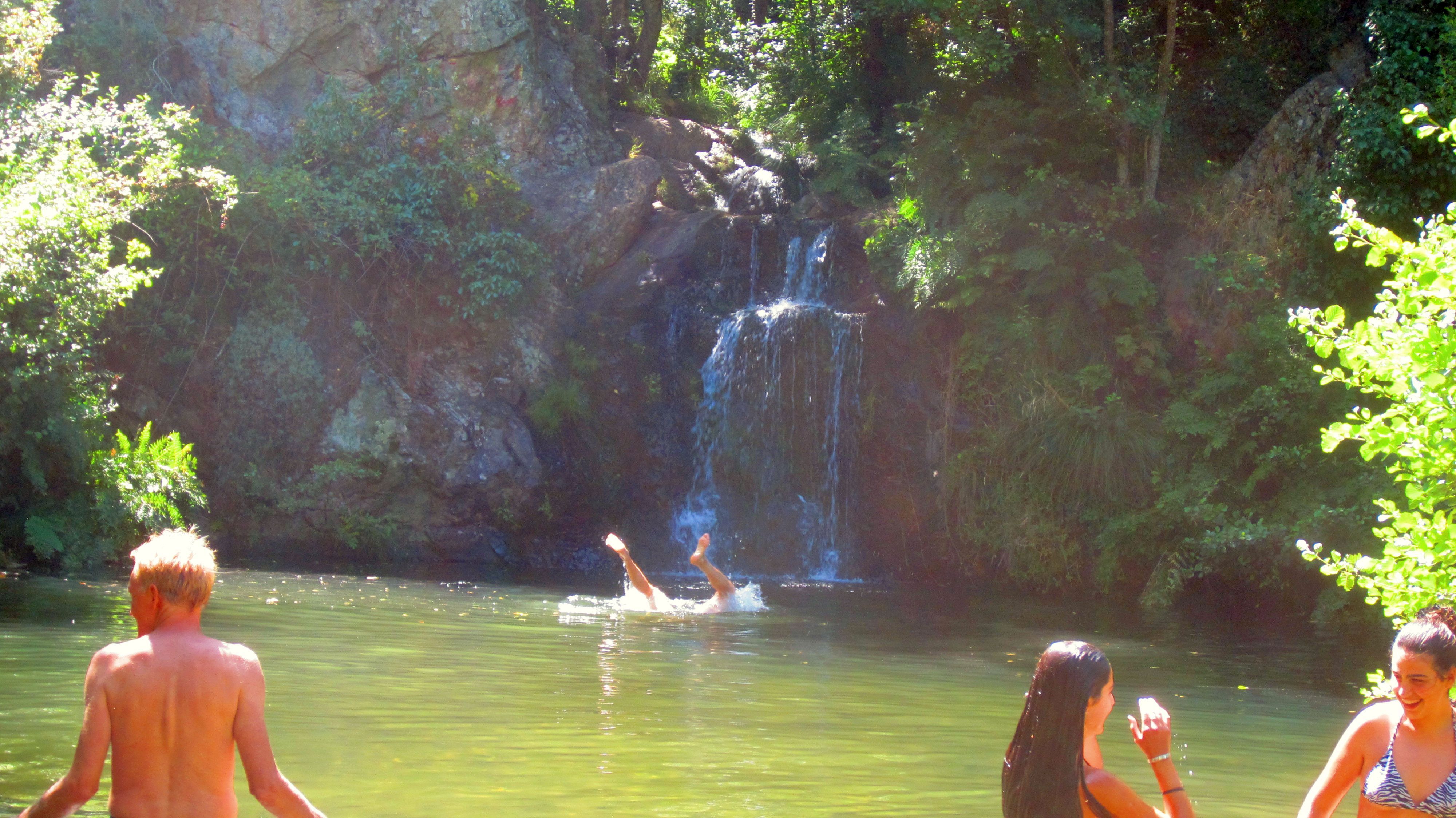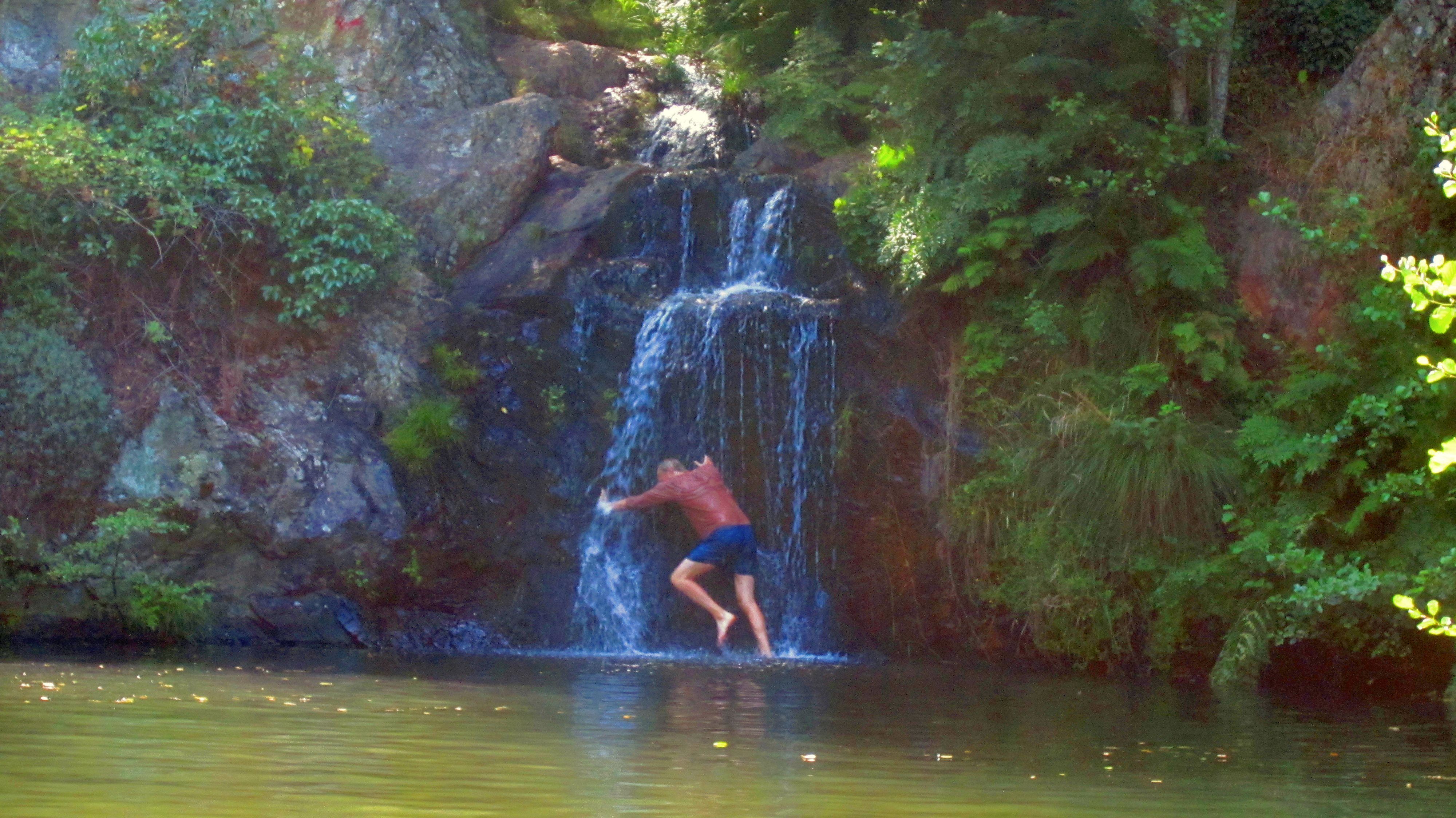 ein, dass einer der Badegäste am Wasserfall einen Jeep mit