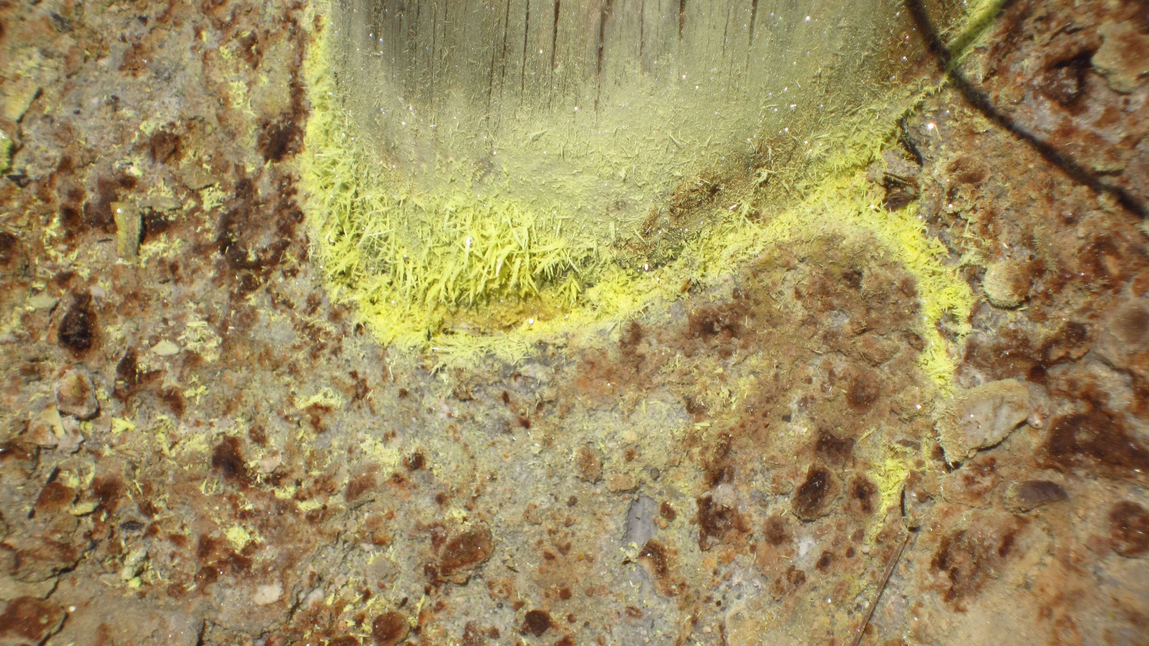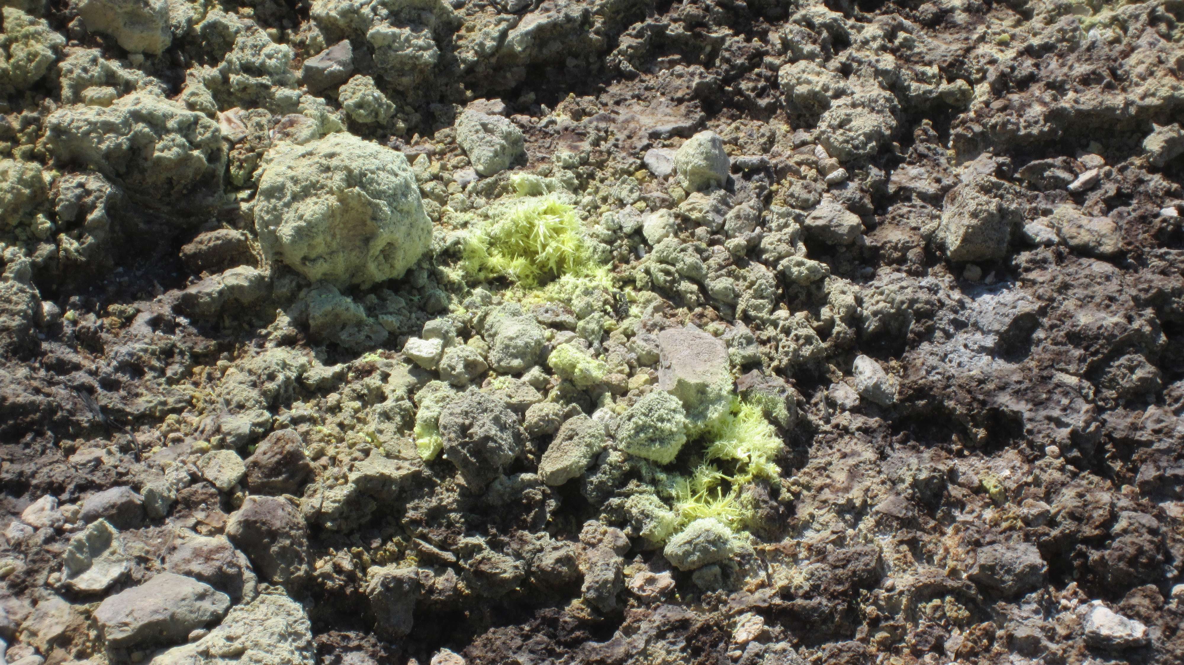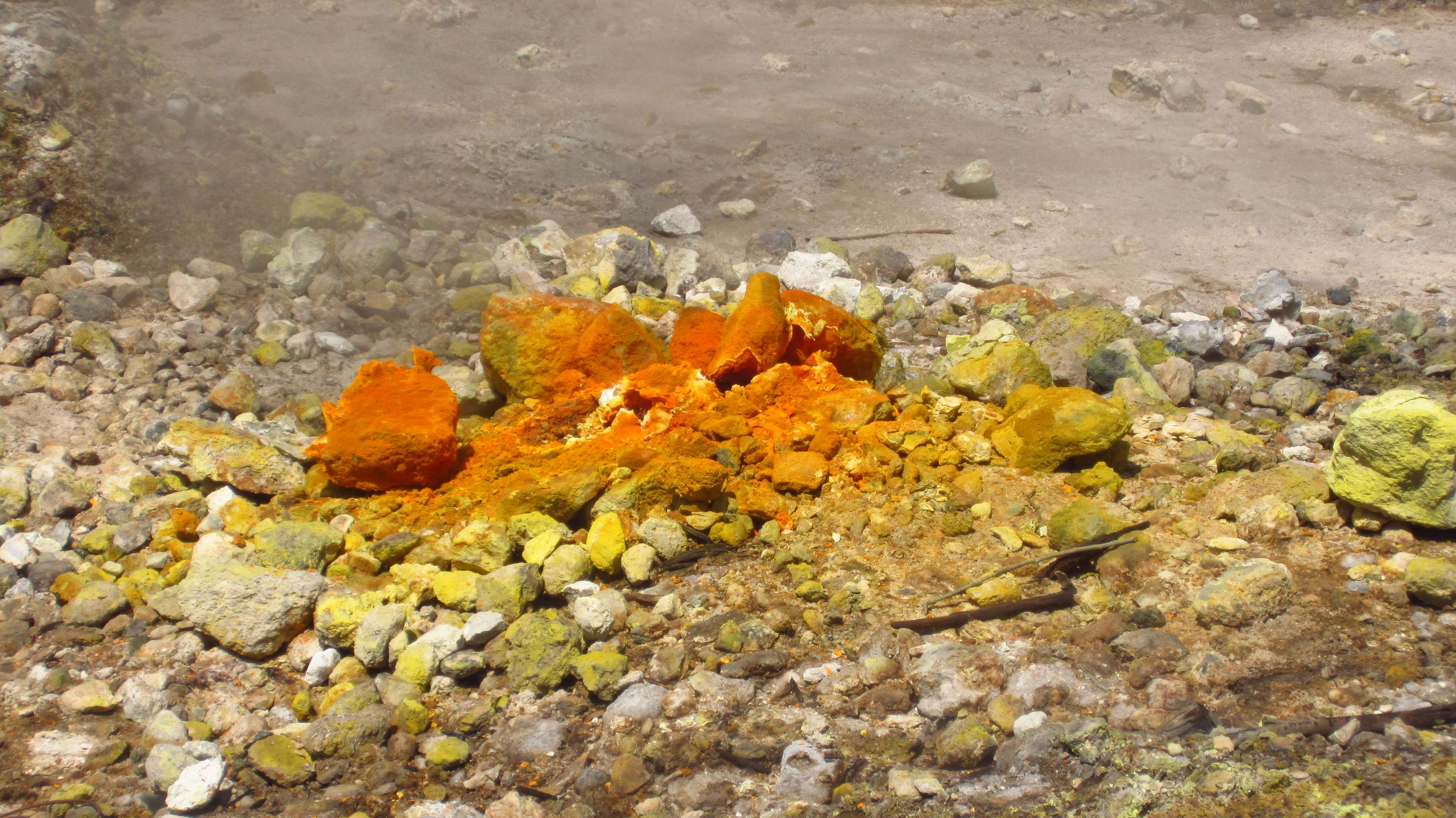Mich faszinieren die Schwefelkristalle, die sich partitiell bilden. Leider kann man kein Steinchen klauen - dafür müßte man über die Absperrung klettern. Würde ich ja... aber es ist mir alles extrem zu heiß. Zudem weiß man tatsächlich nie so genau, wann man sich auf eine Fumerole stellen würde, so dass der glühendheiße Dampf vielleicht doch noch ein Füßchen wegschmort... Nöööööö, das ist nicht erstrebenswert. Die Fotos müssen reichen, sie vermitteln auch durchaus einen Eindruck. |
