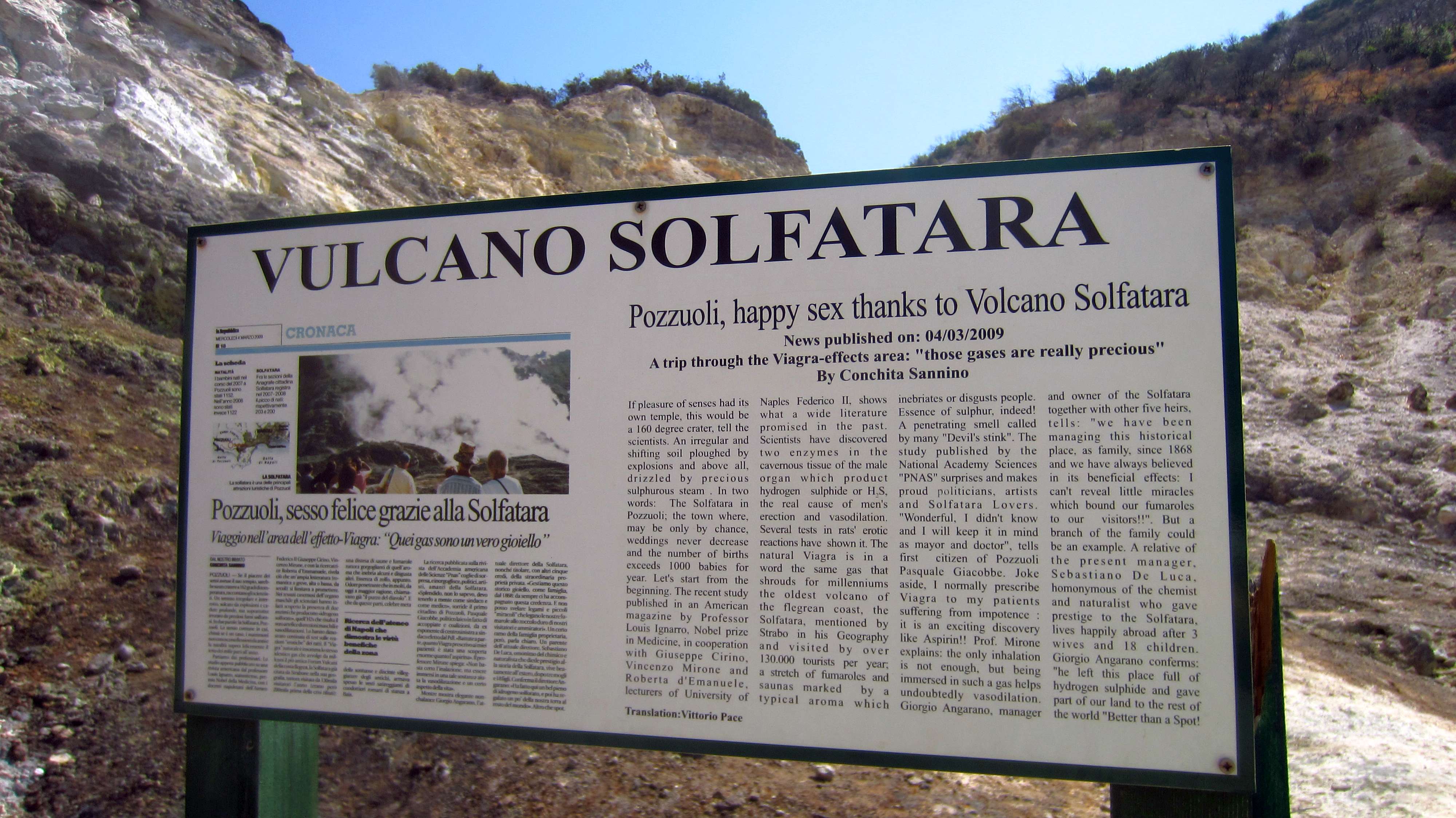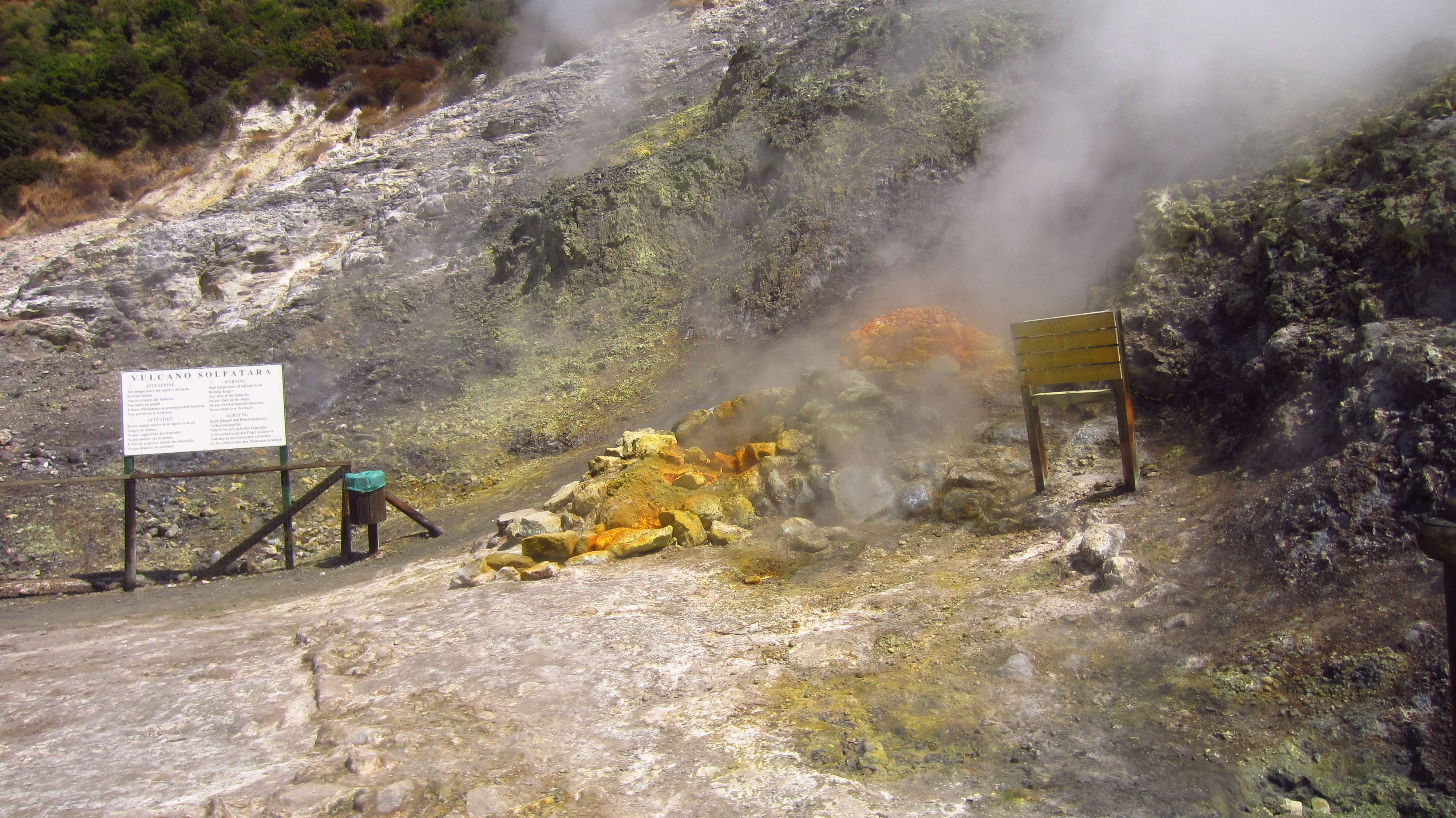 Solfatara, bei Pozzuoli. Ein ebenerdiger Vulkan. Innerhalb eines Jahres hebt und senkt sich der Boden bis zu einem Meter. Ein wahrlich gefährlicher Flecken. Trotzdem wohnen die Menschen direkt drumrum.