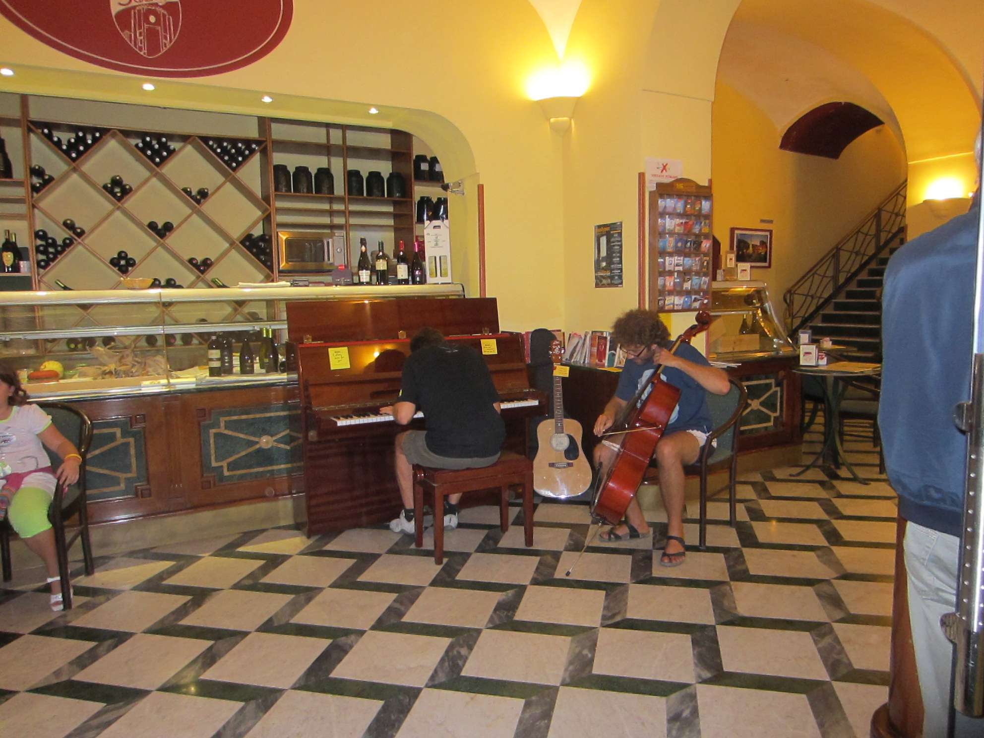 | Zum Abendessen stellt Ingolf sich eine Holzofenpizza vor, im Vorbeigehen hatten wir die entsprechenden Düfte an der Piazza Gésu Nuovo erschnüffelt. Also suchen wir uns dort einen Platz. Ingolfs Pizza ist ganz manierlich - dafür habe ich PECH! Die Speisekarte ist auf Italienisch und auf Englisch geschrieben. Da gibt es bei "Secondo Piatti" etwas das "Baked Linguine" heißt. Ich stelle mir da überbackene oder vielleicht auch gebratene Linguine vor. Also bestelle ich das und noch extra eine Portion Gemüse. Die Kellnerin bringt mir schließlich einen Teller mit Alufolie, worin sich tatsächlich Linguine befinden, fertig mit irgendeiner Soße angerichtet und mit vielen MUSCHELN (Cozze)!!! Davon war keine Rede in der Speisekarte. Die "baked Linguine" lasse ich jedenfalls zurückgehen. Die Kellnerin ist stur und ich gerade nicht in kämpferischer Stimmung... also versuche ich, mich an den Gemüsen satt zu essen. Die schmecken allerdings auch nicht. Mein Essen war der Reinfall. Pech. Egal. Ich freu mich auf den Absacker bei Sédili! Wie jeden Abend ist es dort friedlich und die Getränke kühl. |