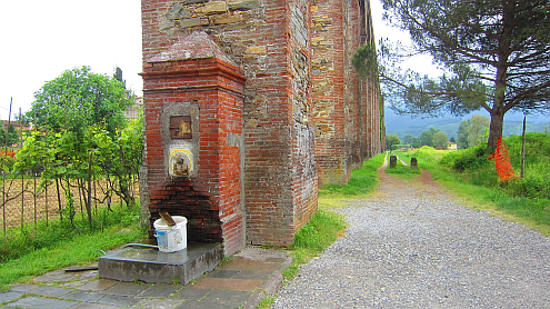 In umgekehrter Richtung schlängelt sich der Weg neben dem Aquädukt quer durchs Tal: Wer dem Nottolini-Pfad in Richtung Lucca folgt, wandert durch bäuerliches Land, vorbei an Brunnen und Zisternenbecken, gemauerten Kanälen für die Felder, vorbei an typischen Höfen und Heuböden. Am Ende des Aquädukts steht der imposante Tempietto S. Concordio, in dem die Stadt Lucca noch einmal das Wasser sammelte.