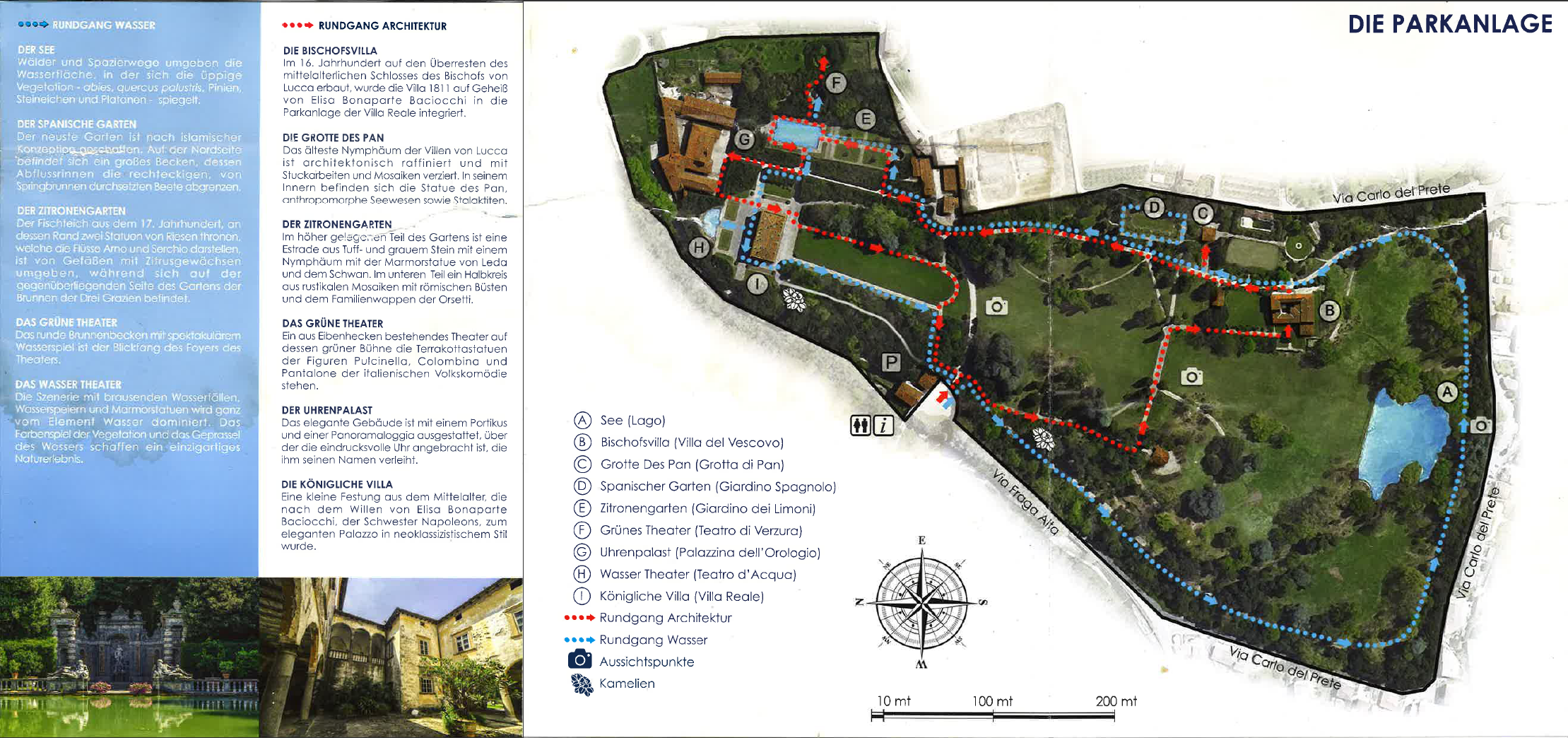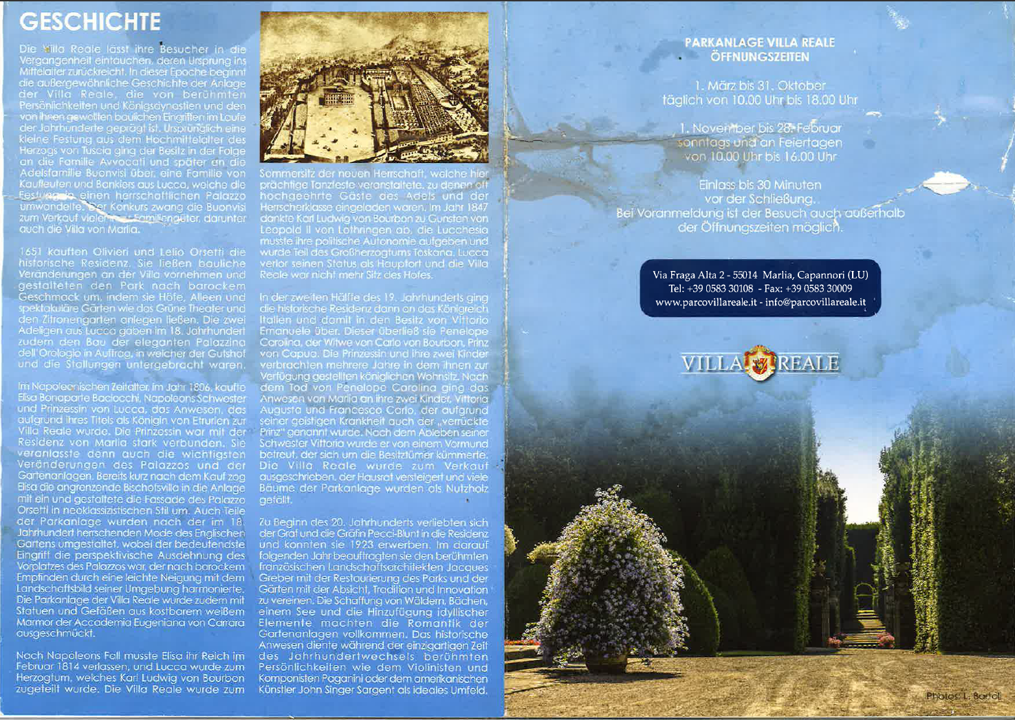 Die großartigste und bekannteste Villa und eine der touristischen Hauptattraktionen der Toskana, ist die Villa Reale di Marlia. Ursprünglich eine kleine Festung des Herzogs von Tucia aus dem 10. Jh., wurde sie im 17. Jh. durch die Orsetti Familie erworben, die den wunderbaren Barockgarten, dekoriert mit herrlichen Wasserspielen, Nymphen und Statuen realisierte. Außerdem gibt es neben diesem „Wasser-Theater“ auch ein „Grünes -Theater“ mit der „Allee der Kamelien“ und zahlreichen seltenen Gewächsen. Im Jahre 1806 wurde die Villa von Elisa Baciocchi erworben, der Schwester Napoleons und Königin von Etruria (von daher rührt der Name Villa Reale). Elisa kaufte auch die Villa del Vescovo und begann umgehend mit den Arbeiten zum Zusammenschluss der beiden Residenzen. Um ihren ganzen Hof unterbringen zu können, wurde das Anwesen um ein Stockwerk aufgestockt. Gleichzeitig nahm man die Veränderung des Gartens in einen Garten im Englischen Stil vor, wobei viele Barockelemente entfernt wurden und nur die Kapelle und die „Grotte des Pan“ verschont blieben. Nach dem Sturz Napoleons waren zunächst die Ducas von Parma und anschließend die Granducas der Toskana im Besitz der Villa, die beim Zusammenschluss Italiens an Vittorio Emanuelle überging. Der König überließ sie dem Prinzen Carlo, dem Bruder des letzten Königs der „Zwei Sizilien“. Dieser war aufgrund seiner Heirat mit Penelope Smyth, einer nicht adeligen Engländerin, enterbt worden. Carlo und seine Frau verbrachten den Rest ihres Lebens auf dem Besitz und fanden in der Parkkapelle ihre letzte Ruhestätte. Um die Schulden ihres exzentrischen Sohnes zu begleichen, wurde die Villa zum Verkauf ausgeschrieben, die Möbel versteigert und viele Bäume des Parks als Nutzholz gefällt. Der Conte und die Contessa Pecci-Blunt, die Eltern der heutigen Besitzer, erwarben 1923 rechtzeitig die Villa, um der kompletten Zerstörung des Parks Einhalt zu gebieten. Sie beauftragten einen berühmten französischen Gartenbauarchitekten, Jacques Greber, mit der Restaurierung des Gartens. Es wurden Wälder, Bäche und ein See geschaffen. Sie bilden die romantische Ergänzung zu den klassischen italienischen Gärten, die aus der Zeit der „Orsetti“ stammen. Gemeinsam mit der Kommune Lucca und der Region Toskana veranstaltet die Familie Pecci-Blunt in den Sommermonaten Freilicht-Konzerte und Ballettaufführungen.