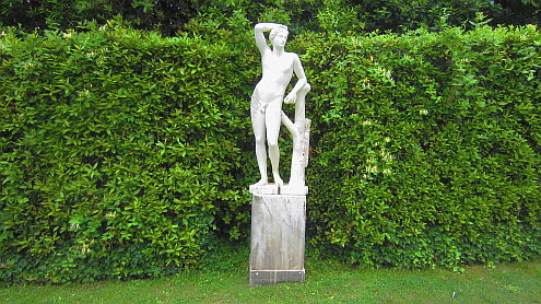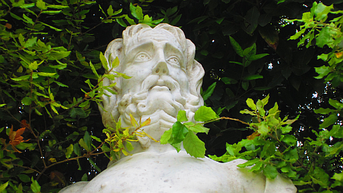 Eibenzweige kitzeln die steinerne Colombina unter der Achsel. Mit Pantalone und Arlecchino steht sie in einem der berühmtesten Heckentheater der Welt – hier spielte Paganini. Nicht mehr lange, und auch die Ohren, Nasen und Rockzipfel sind im Gebüsch verschwunden.