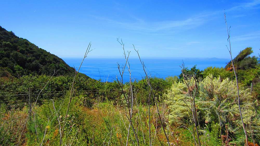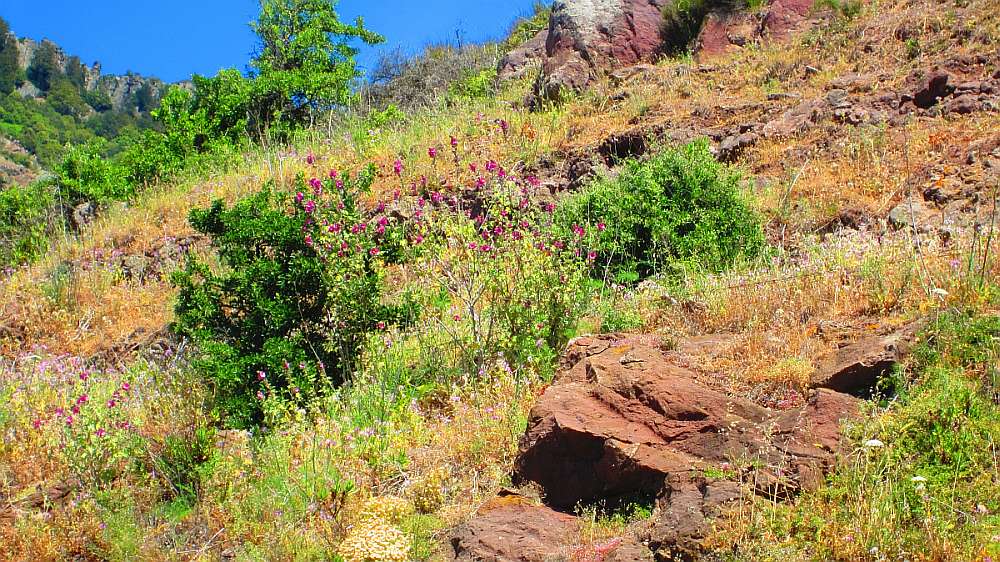 ![]() Den blühenden Ginster kenne ich ja auch von Korsika. Und die Wolfsmilchsträucher weiter unten, mit ihren rötlichen Blätter, die gibts auf Korsika auch. |