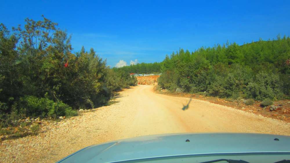 An einer Weggabelung (ein Weg führt eher abwärts, einer aufwärts) bleiben sie unschlüssig vor mir stehen. Ausgeschildert ist ja wieder nichts... Ich frage durch das Fenster, ob sie sich auskennen. Es sind Türken - nein, sie wissen nicht, welchen Weg man nehmen muss. Ich biete an, voraus zu fahren - und fahre links, also eher bergab. Nach ein paar Metern kommt uns ein Bauer zu Fuß entgegen. Den frage ich nach Kyaneai... er winkt ab und deutet zum Weg aufwärts. Also drehen wir um.