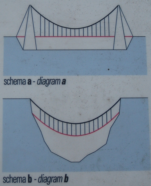 Auf der anderen Seite stelle ich fest, dass man problemlos mit dem Auto an die Brücke hätte heranfahren und parken können. Wir hätten nicht diesen Kletterweg von der Straße herab nehmen müssen. Zu spät. Übereifer schadet eben nur. Hier auf der anderen Seite gibt es eine bequeme Aussichtsplattform mit beschreibenden Texten zur Brückenkonstruktion. Wie schön, da lernen wir jetzt gleich was.. |